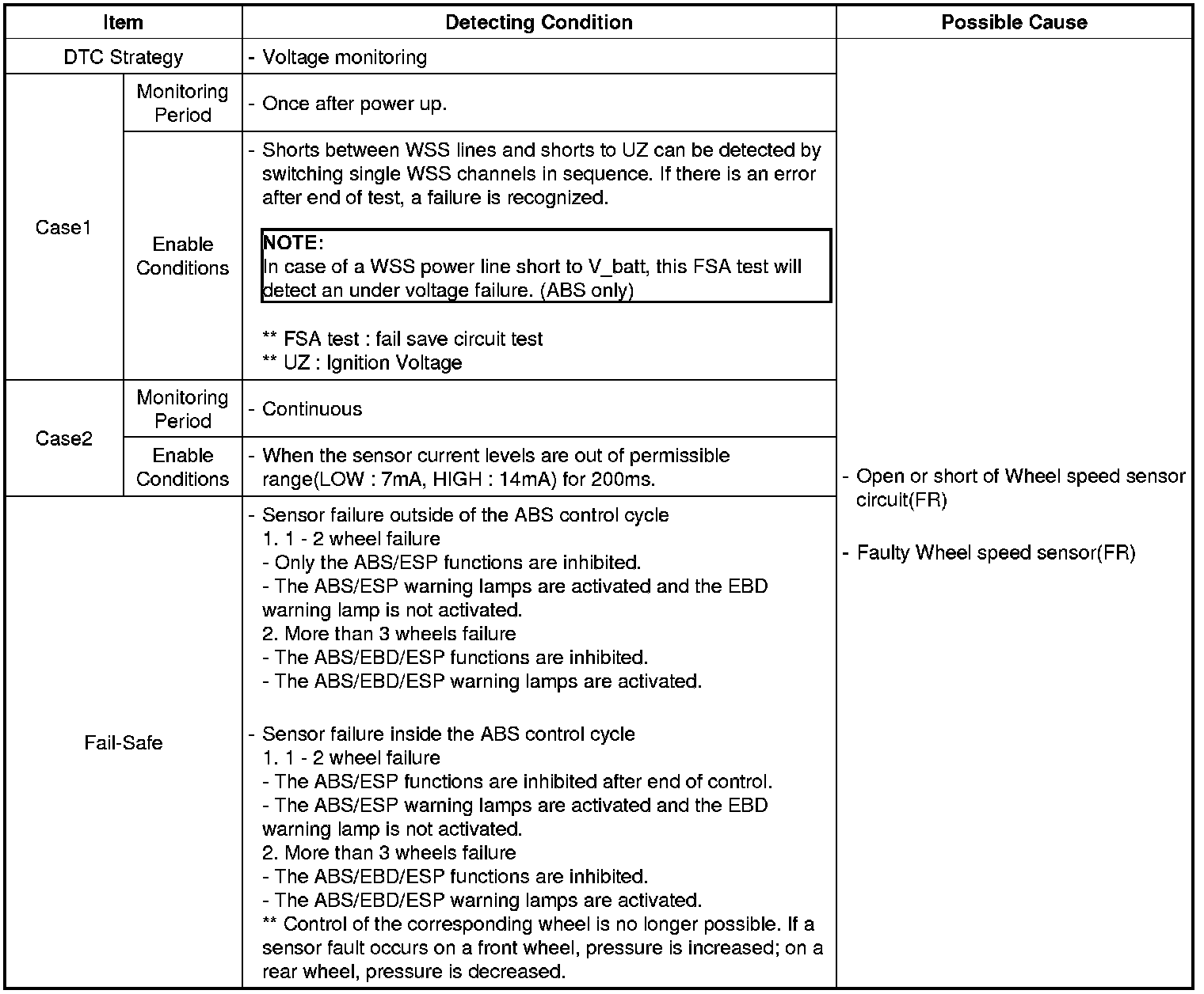 If the WSS circuit is broken, in that case a fault is detected by detecting abnormal input current. HECU cuts off the voltage supply to wheel sensor channel which had a fault and prevent vehicle's damage due to super heated harness.