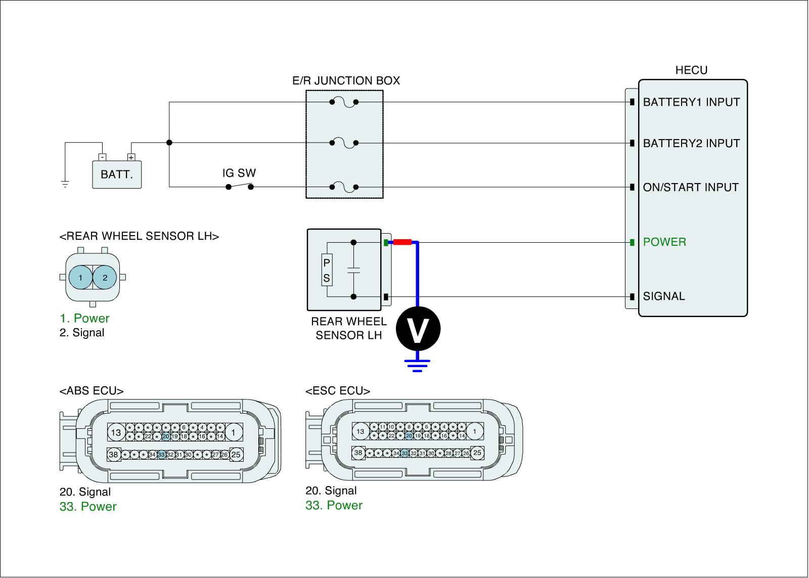 2. Measure voltage between power terminal of the wheel speed sensor harness connector and chassis ground.