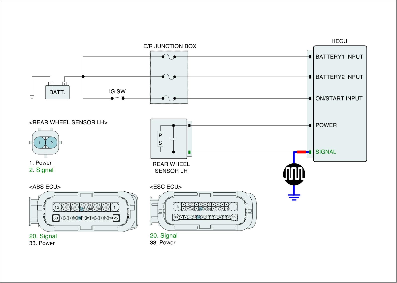 4. Measure waveform between wheel speed sensor signal terminal of the HECU harness connector and chassis ground with oscilloscope.