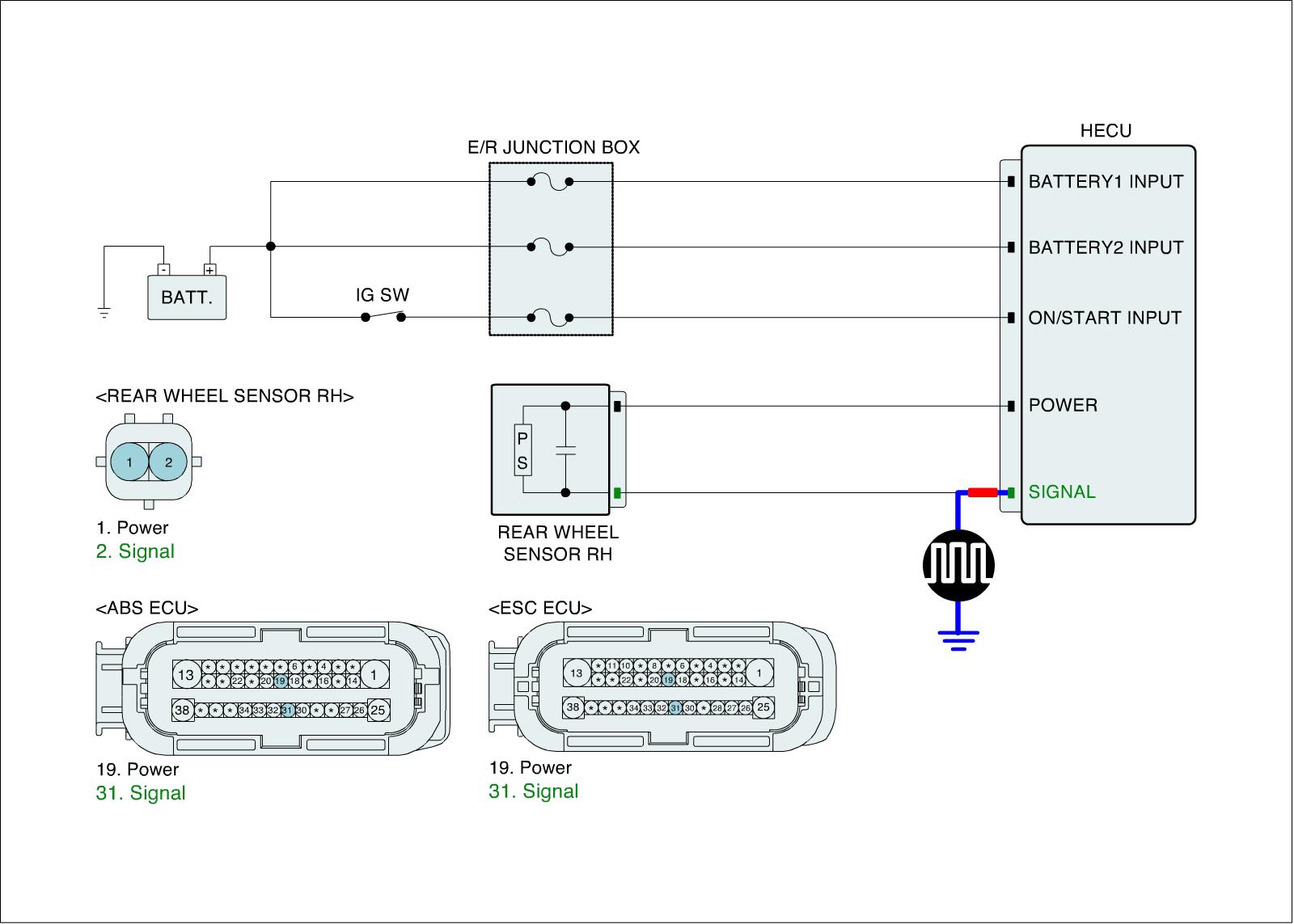 4. Measure waveform between wheel speed sensor signal terminal of the HECU harness connector and chassis ground with oscilloscope.