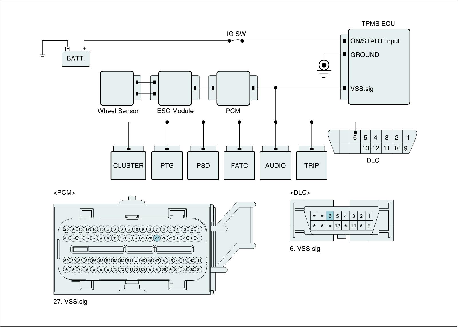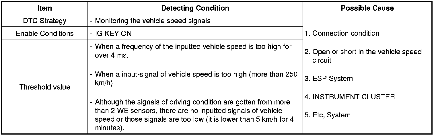 The TPMS ECU monitors signals of vehicle speed and if it is detected as a fault in the vehicle speed signal 1 circuit, this DTC is set.