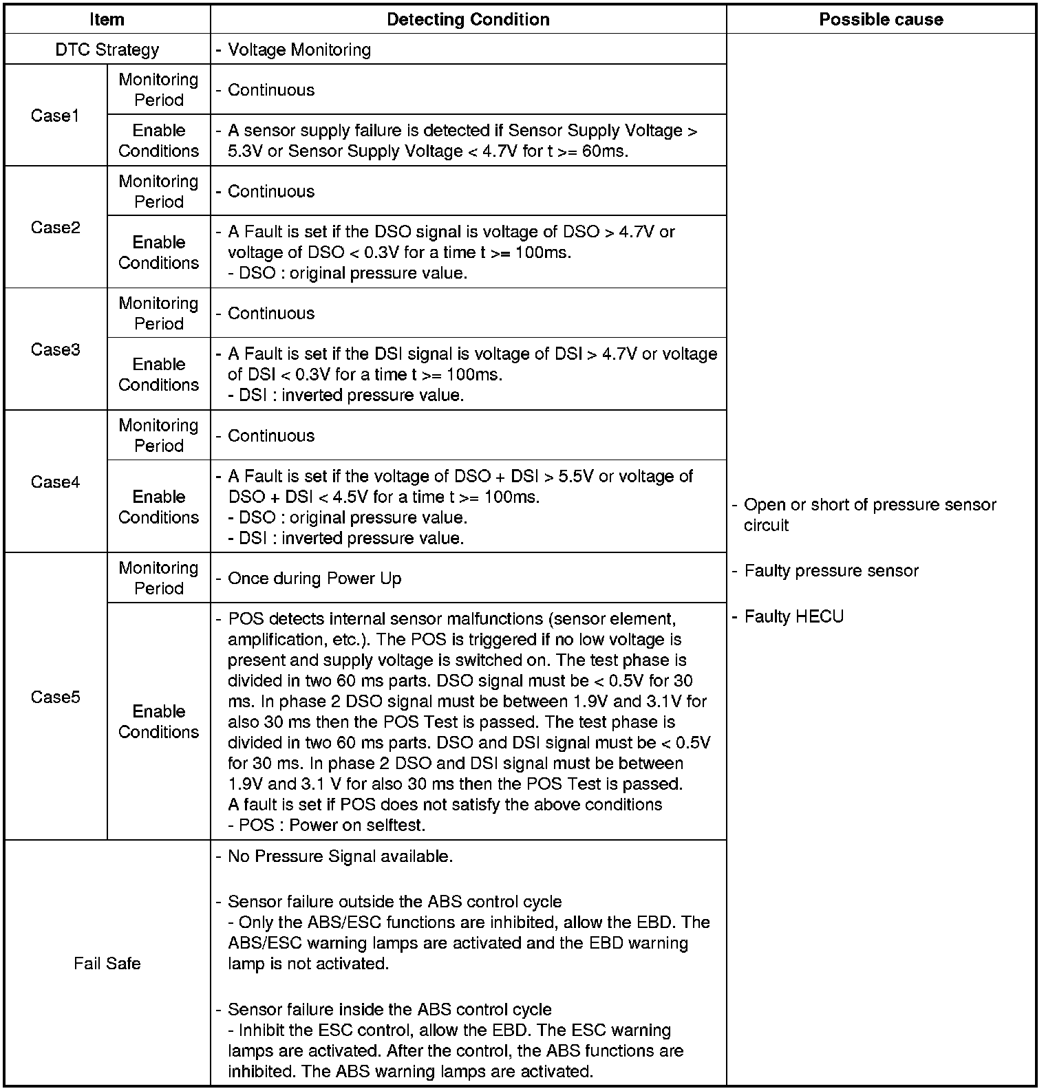 A failure is detected if the output signal value is out of specified range for more than 100 ms or pressure sensor self test form is against to specification during self test.