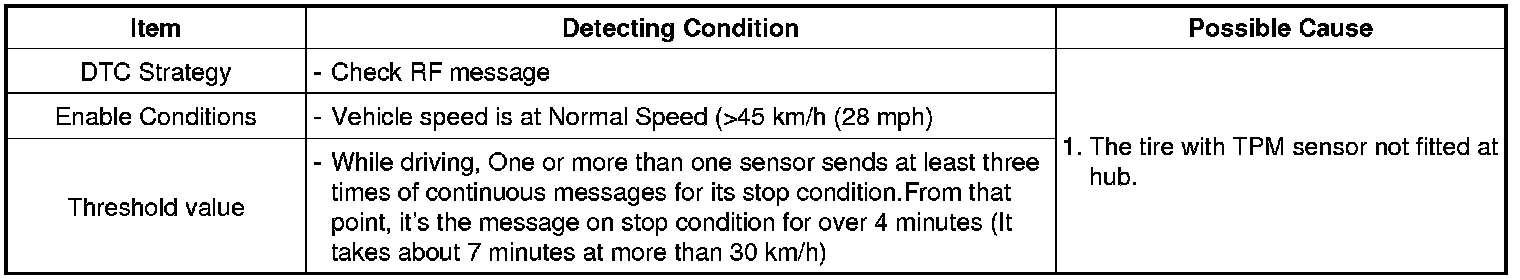 When a vehicle is driving, the TPMS ECU gets signals that it stops from WE sensor. At this time, the TPMS ECU sets this DTC.