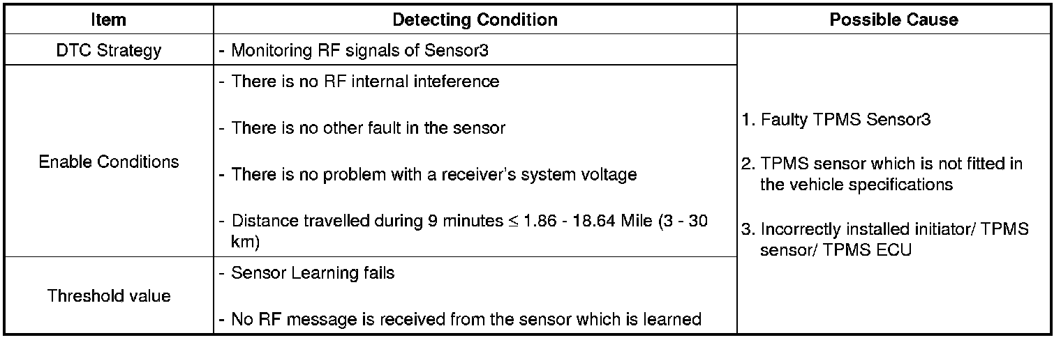The TPMS ECU monitors the RF signal of the sensor and if it is not received, this DTC is set.