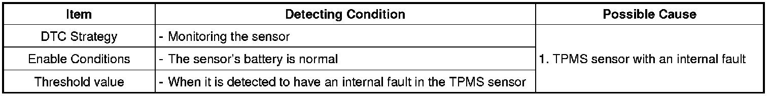 The TPMS ECU monitors the TPMS sensor and if it is detected as an internal fault in the sensor, this DTC is set.
