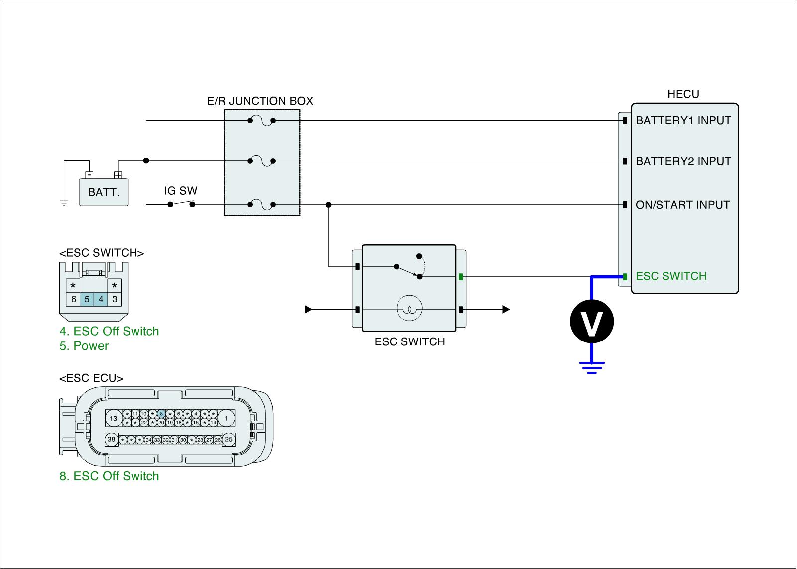 3. Measure voltage between ESC switch signal terminal of the HECU harness connector and chassis ground.