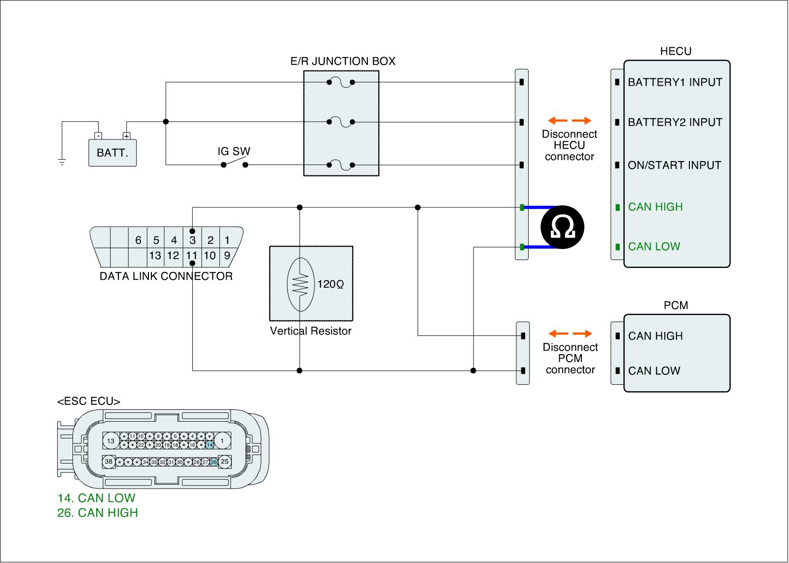 3. Measure resistance between CAN LOW terminal and CAN HIGH terminal of the HECU harness connector.
