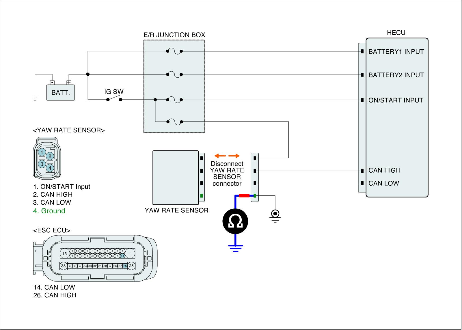 3. Measure resistance between CAN HIGH (LOW) terminal of the HECU harness connector and CAN HIGH (LOW) terminal of the Yaw rate & lateral G sensor harness connector.