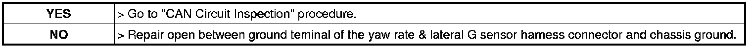 3. Measure resistance between ground terminal of the yaw rate & lateral G sensor harness connector and chassis ground.