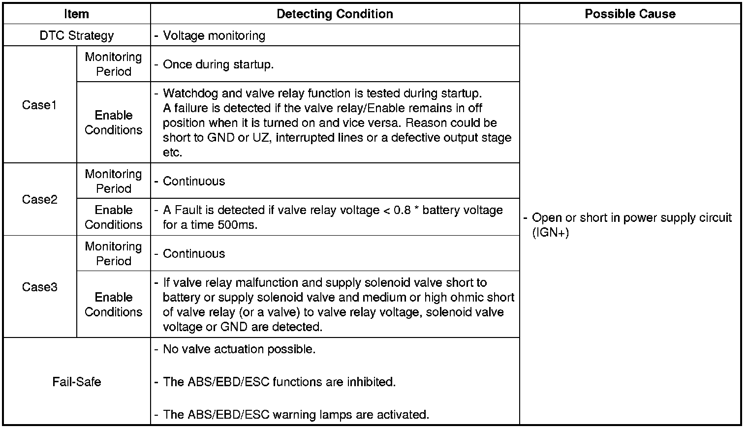 When the valve relay is switched to ON, the HECU will set this code if the solenoid drive voltage is below permissible voltage ranges for a period of time.