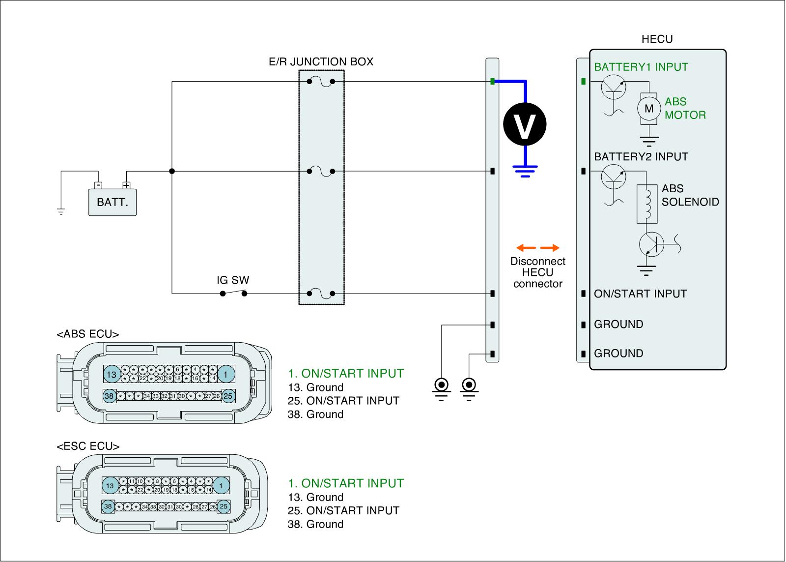 2. Measure voltage between power terminal of the HECU harness connector and chassis ground.