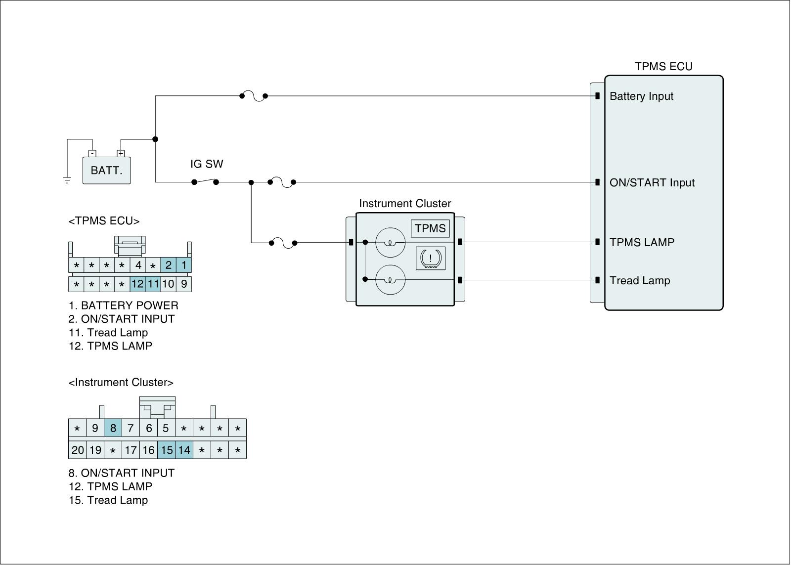The TPMS system is the shorten word of Tire Pressure Monitoring System. This system monitors the pressure of the tire and when it drops below a certain pressure, the TPMS ECU makes the warning lamp turn on for notifying the driver. This system consists of TPMS ECU (or TPMS Receiver) and TPMS sensors. If the air pressure of a tire drops below a certain value, the TPMS ECU makes the tread lamp turn on for letting a driver know.