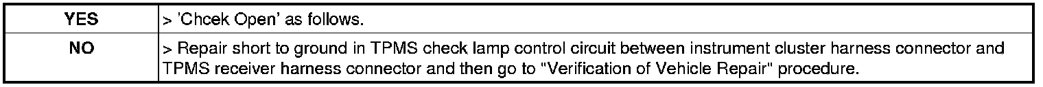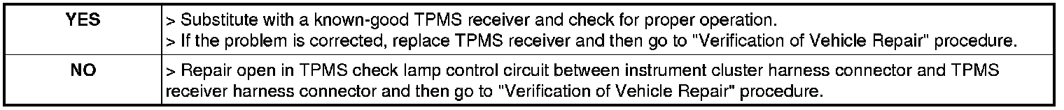 3. Measure resistance between TPMS check lamp control terminal of TPMS receiver harness connector and TPMS check lamp control terminal of instrument cluster harness connector.
