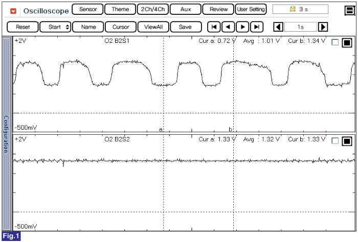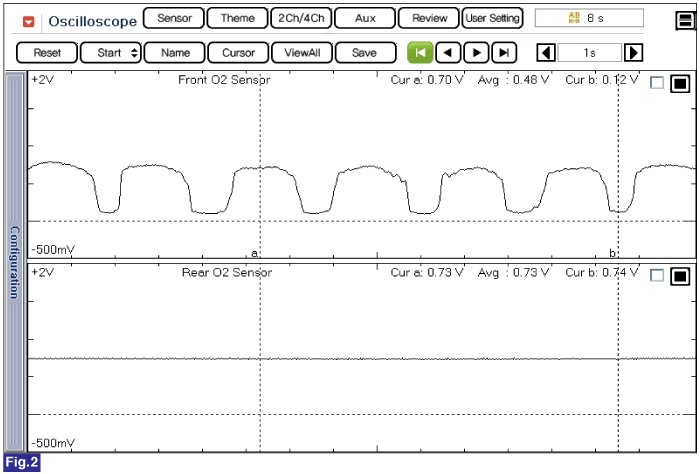 Fig.2) Normal waveforms of front HO2S (the upper) and rear HO2S (the lower) (sensor ground used)