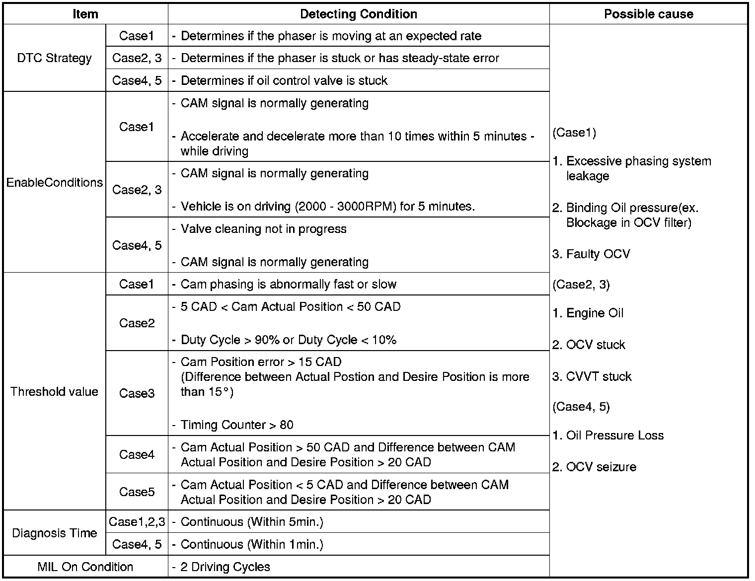 If the CAM Actual Position is too high or low and Difference between Cam Actual Position and Desire Position is higher than 20° PCM determines that a fault exists and a DTC is stored.