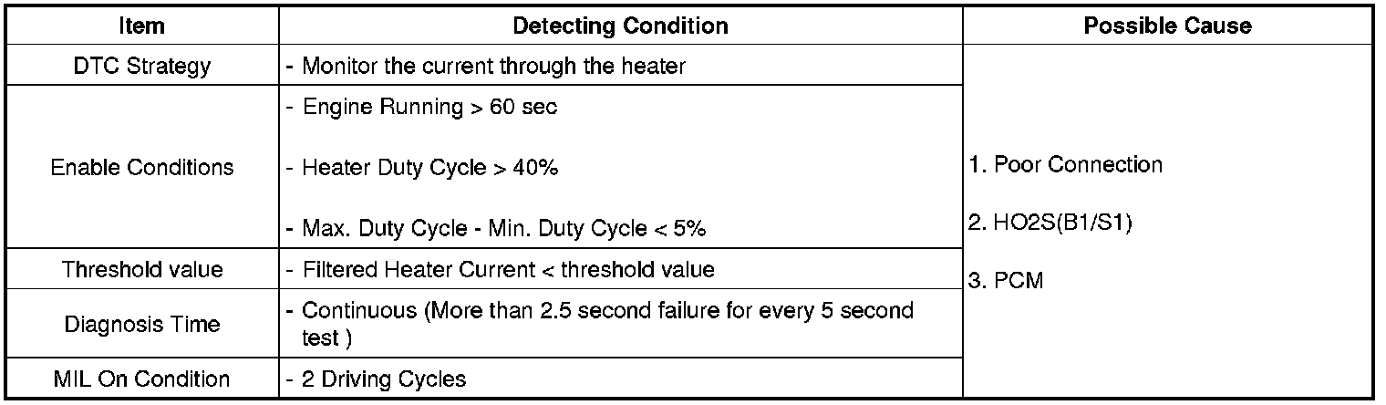 The output voltage of front HO2S is changed continuously according to air/fuel ratio, PCM controls fuel amount based on this value. Preheating is necessary for HO2S normal operation. Therefore heater unit is installed in HO2S, PCM can control air/fuel ratio with the output signal of HO2S simultaneous with engine run by reducing preheating time. PCM controls heater with duty cycle. HO2S' power source is main relay and PCM operates heater by ground control.