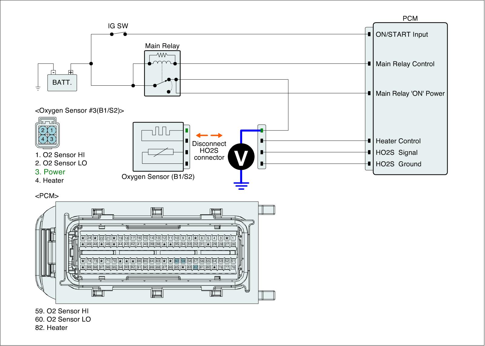 1. IG "OFF" and disconnect HO2S (B1/S2) and PCM connector.
