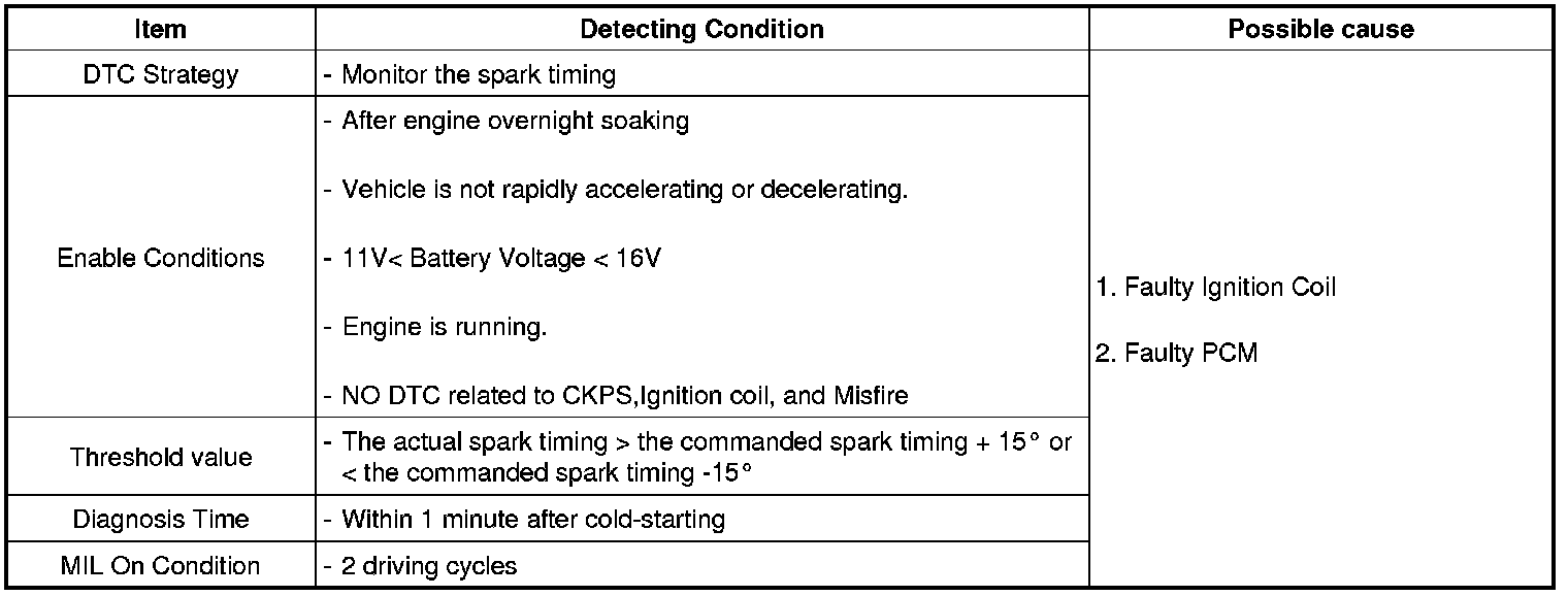 Checking spark timing under detecting condition, if the actual spark timing differs from the commanded spark timing, PCM sets this DTC. MIL (Malfunction Indication Lamp) turns on when the malfunction lasts till consecutive 2 driving cycle.