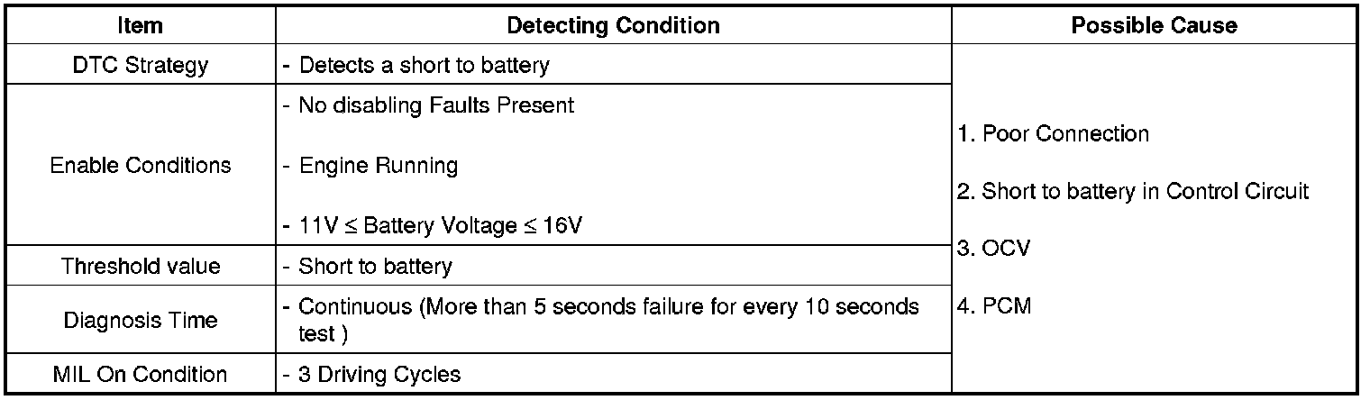 When the enable condition is satisfied The PCM checks that high and low outputs (Voltage level) are observed when OCVs are commanded. When a OCV output failure is detected, the appropriate fail counter is incremented.