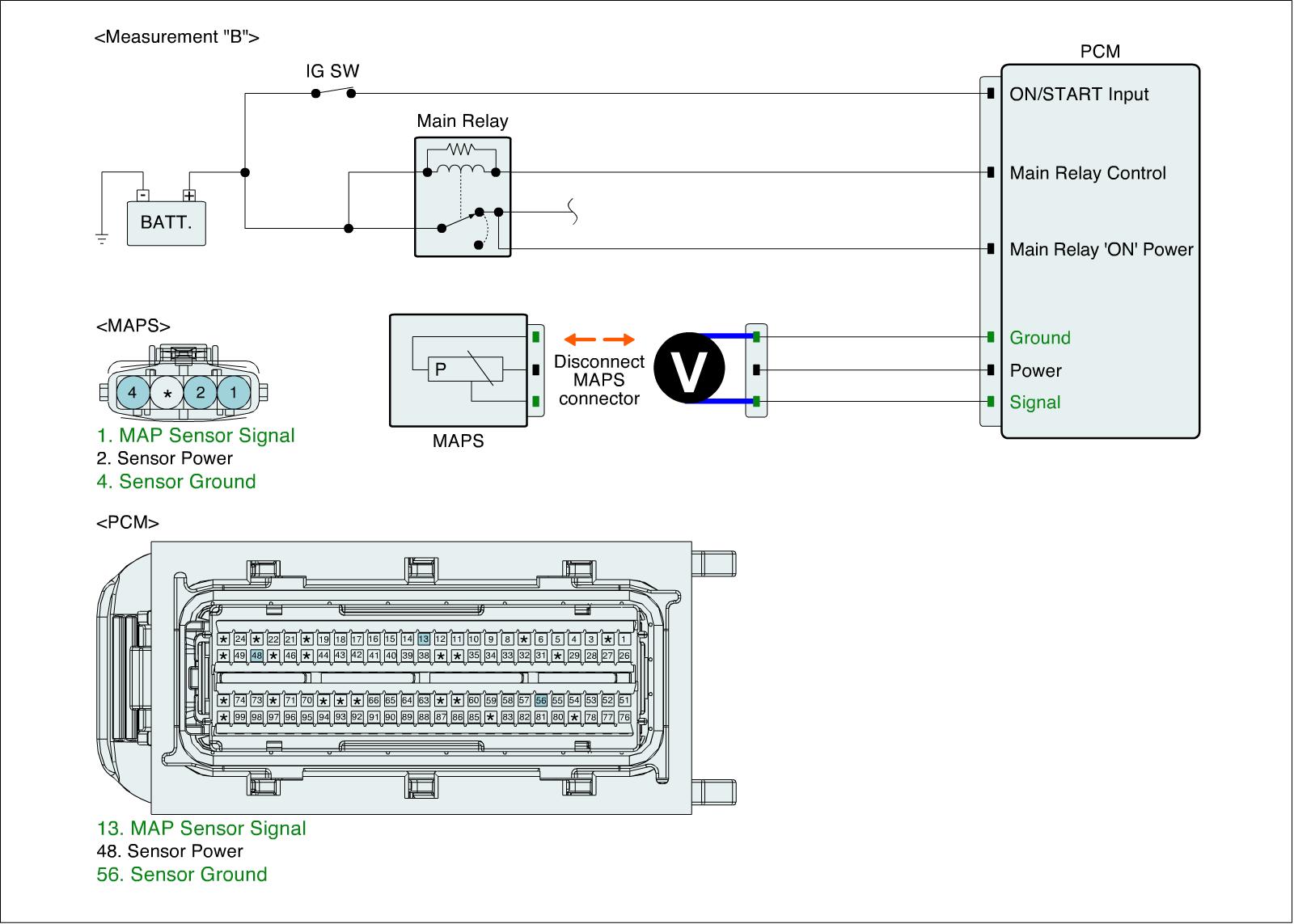 3. Measure voltage between signal and ground terminals of MAPS harness connector (Measurement "B")