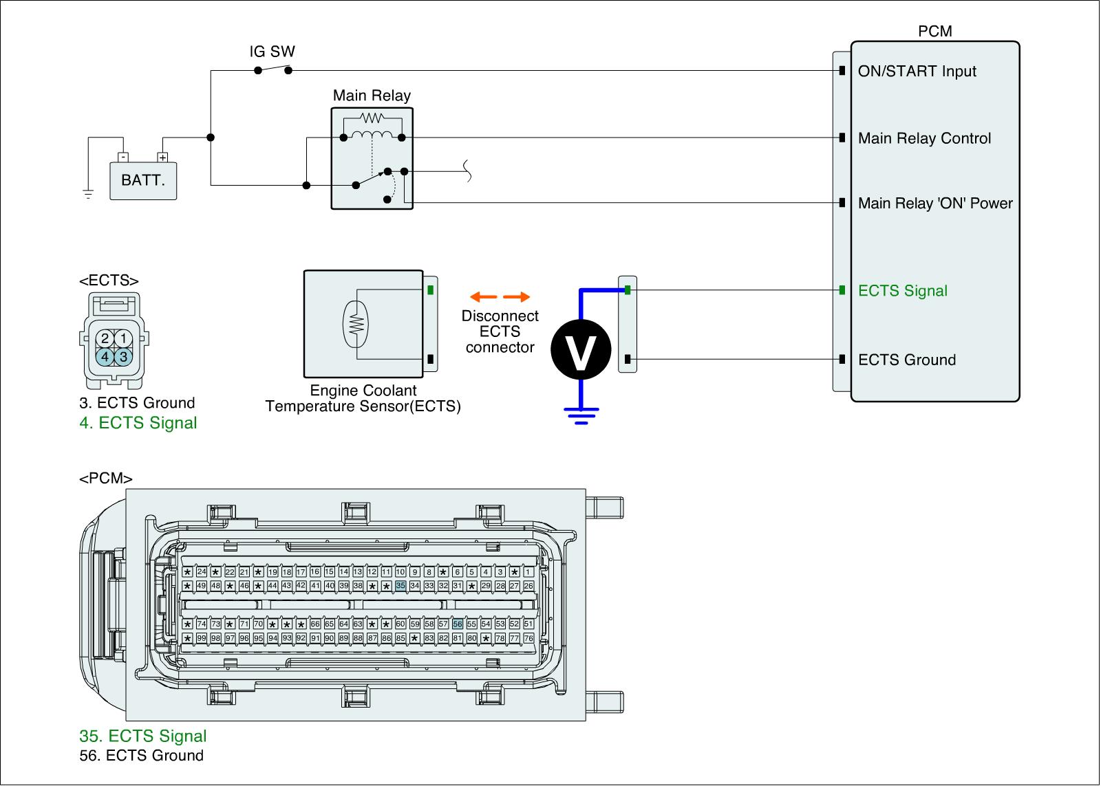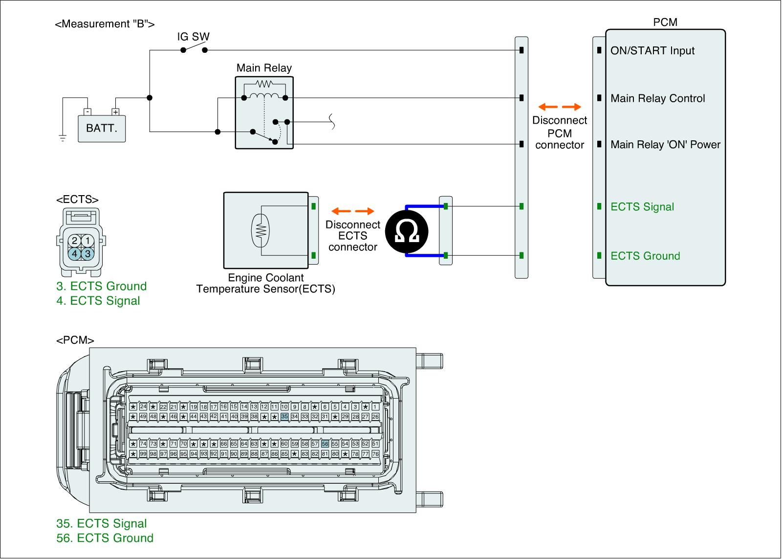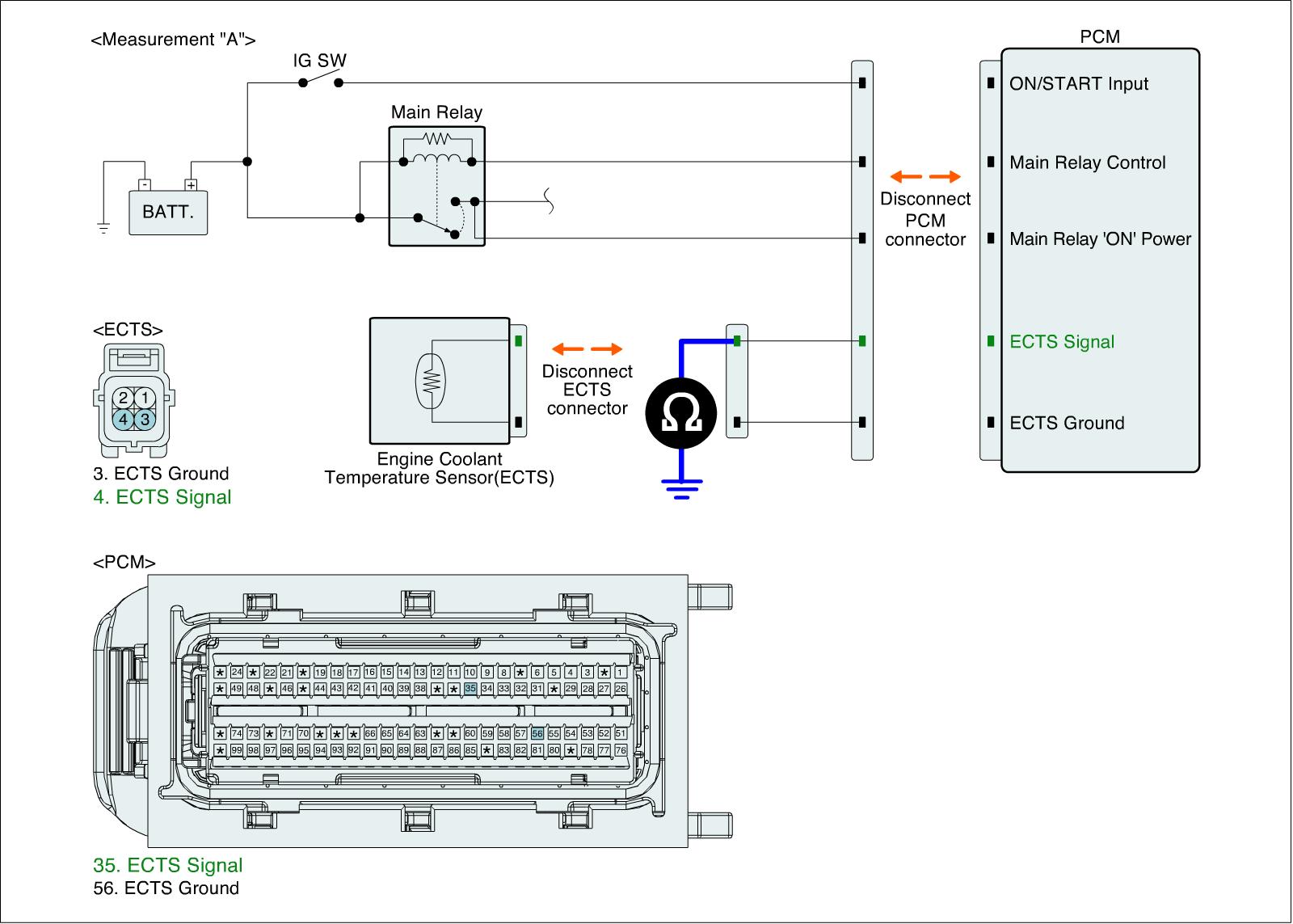 1. IG "OFF" and disconnect ECTS connector and PCM connector.