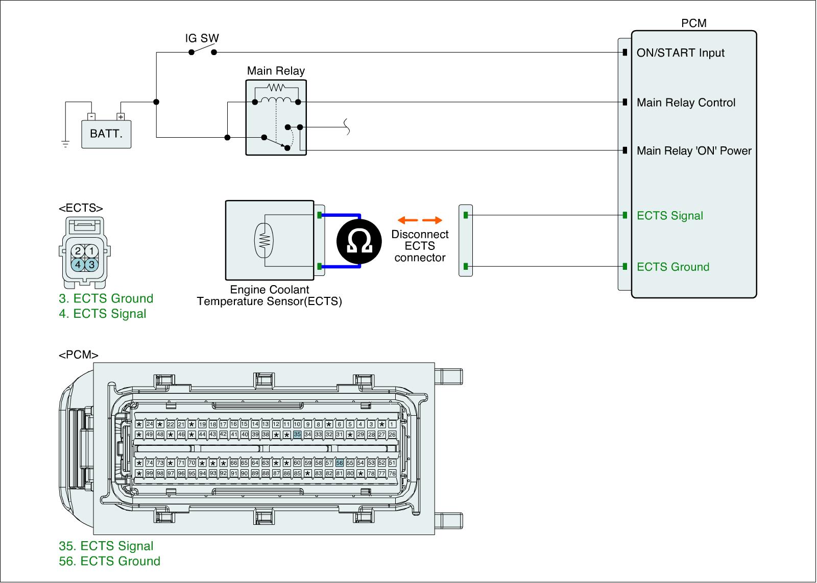 2. Measure resistance between signal and ground terminals of ECTS connector after checking out the temperature of ECTS with GDS (Component Side).