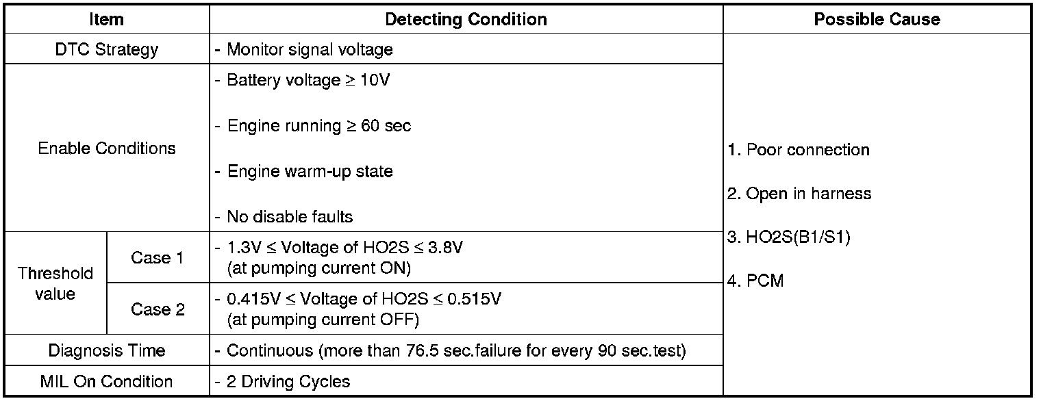 After warming-up, if accelerator pedal is released suddenly around 4000 rpm, the HO2S signal reading will be lower than 200 mV resulting from Fuel cut-off for the moment. Conversely, if suddenly accelerator pedal is depressed, HO2S signal reading will be around 0.6 V ~1.0 V. At idle, Normally HO2S signal will switch from lean to rich with 3 Hz. And as racing, Its frequency rises.