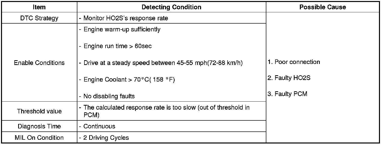 After warming-up, if accelerator pedal is released suddenly around 4000 rpm, the HO2S signal reading will be lower than 200 mV resulting from Fuel cut-off for the moment. Conversely, if suddenly accelerator pedal is depressed, HO2S signal reading will be around 0.6 V ~1.0 V. At idle, Normally HO2S signal will switch from lean to rich with 3 Hz. And as racing, Its frequency rises.