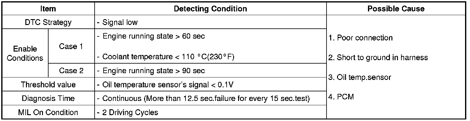 Checking output signals from oil temperature sensor every 15 sec. under detecting condition, if an signal is low for more than 12.5 sec., PCM sets P0197.