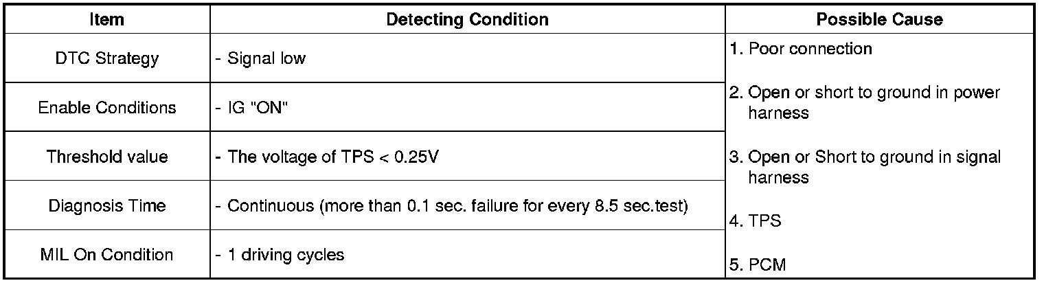 Checking output signals from TPS2 every 8.5 sec. under detecting condition, if an output signal is below 0.25 V for more than 0.1 sec., PCM sets P0222.