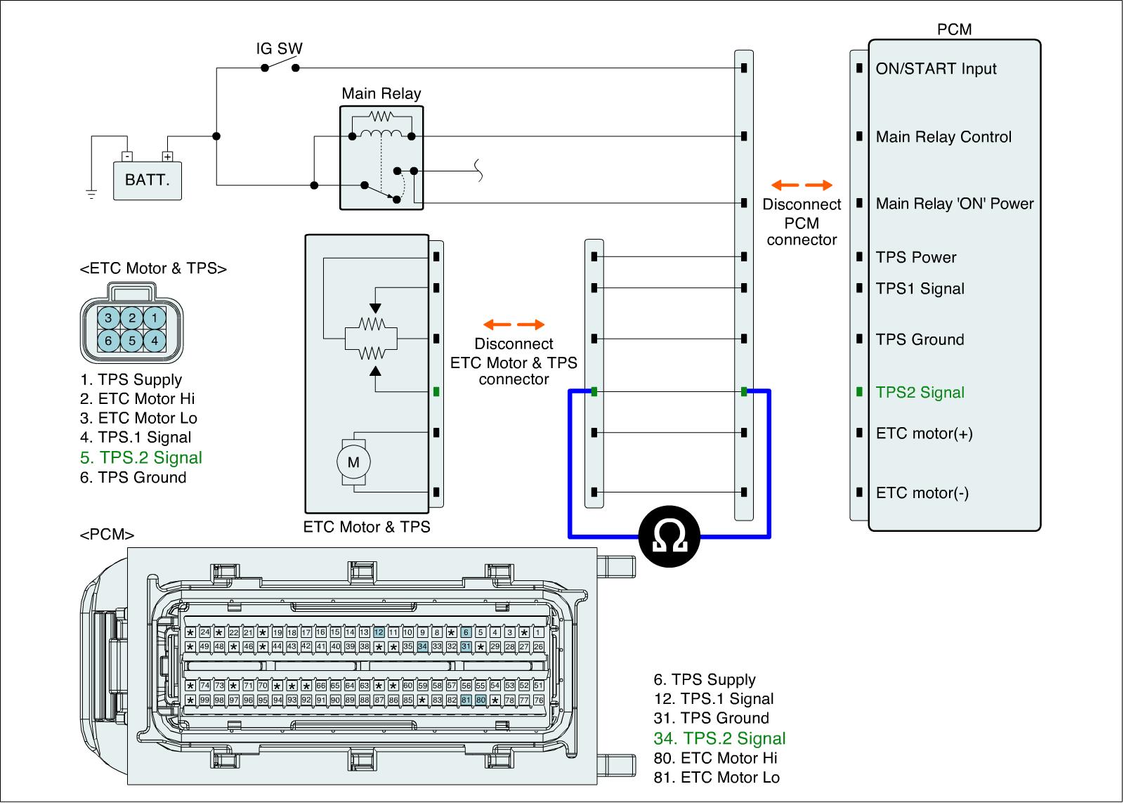 2. Measure resistance between TPS2 signal terminal of ETC Motor & TPS harness connector and TPS2 signal terminal of PCM harness connector.