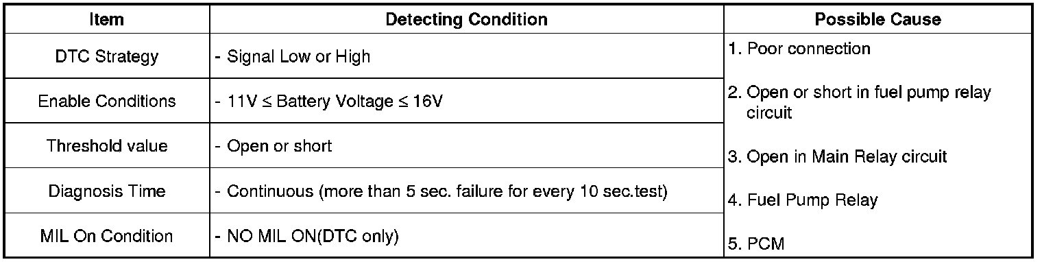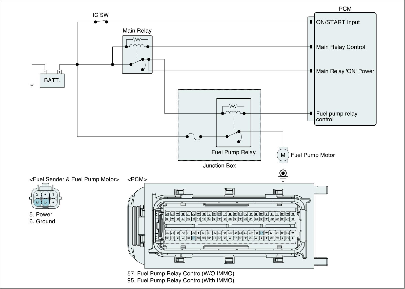 The PCM provides ground to one side of the coil in the fuel pump relay to control the fuel pump relay. The other side of the fuel pump relay coil is connected to main relay, which activates when the ignition switch is ON. The PCM monitors the control circuit between the fuel pump relay and the PCM. When the ignition switch is turned ON, the PCM energizes the fuel pump relay, which sends power to the fuel pump.