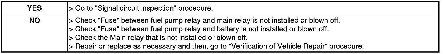 3. Measure voltage between fuel pump relay control terminal of Fuel pump relay harness and chassis ground.