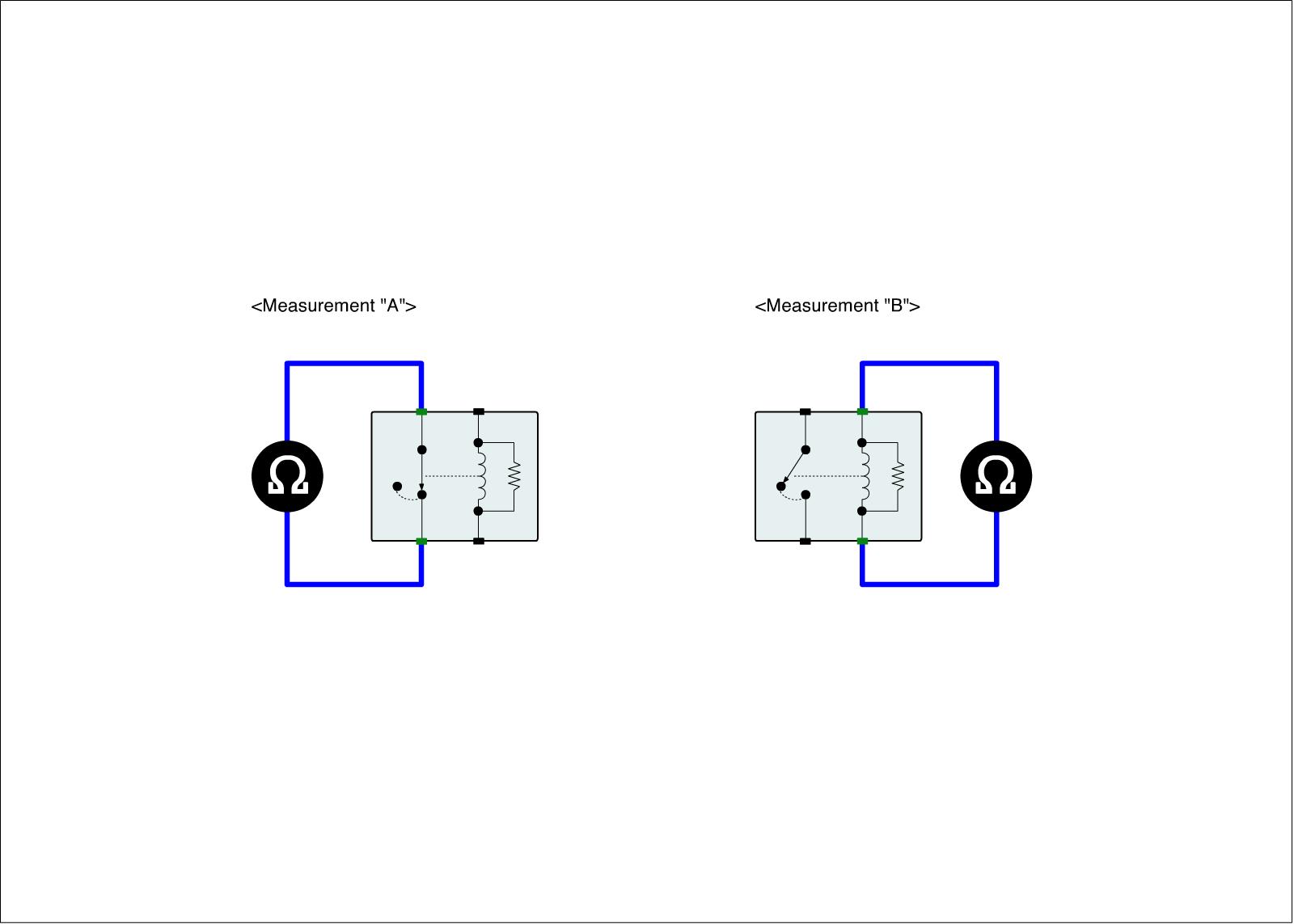 2. Measure resistance between battery power supply and power supply to fuel pump motor terminals of fuel pump relay. (Measurement "A")