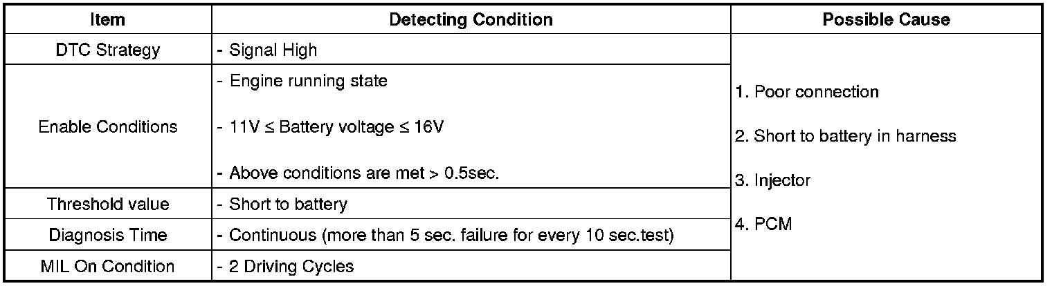 Checking output signals from injectors. Under detecting condition, if an output signal is high, PCM sets P0274.