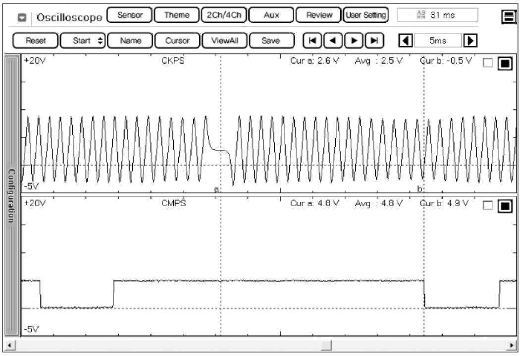 2. Monitor these signal waveforms from CAM and Crank shaft position Sensor are correctly aligned.