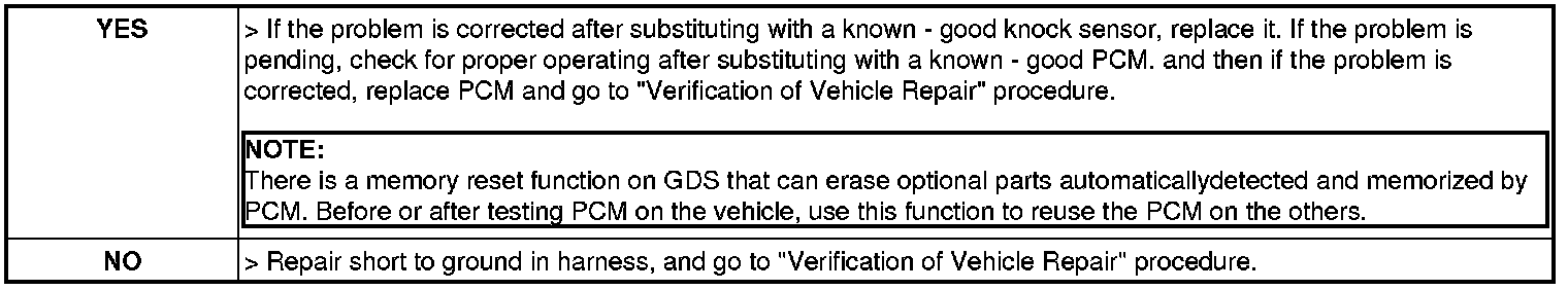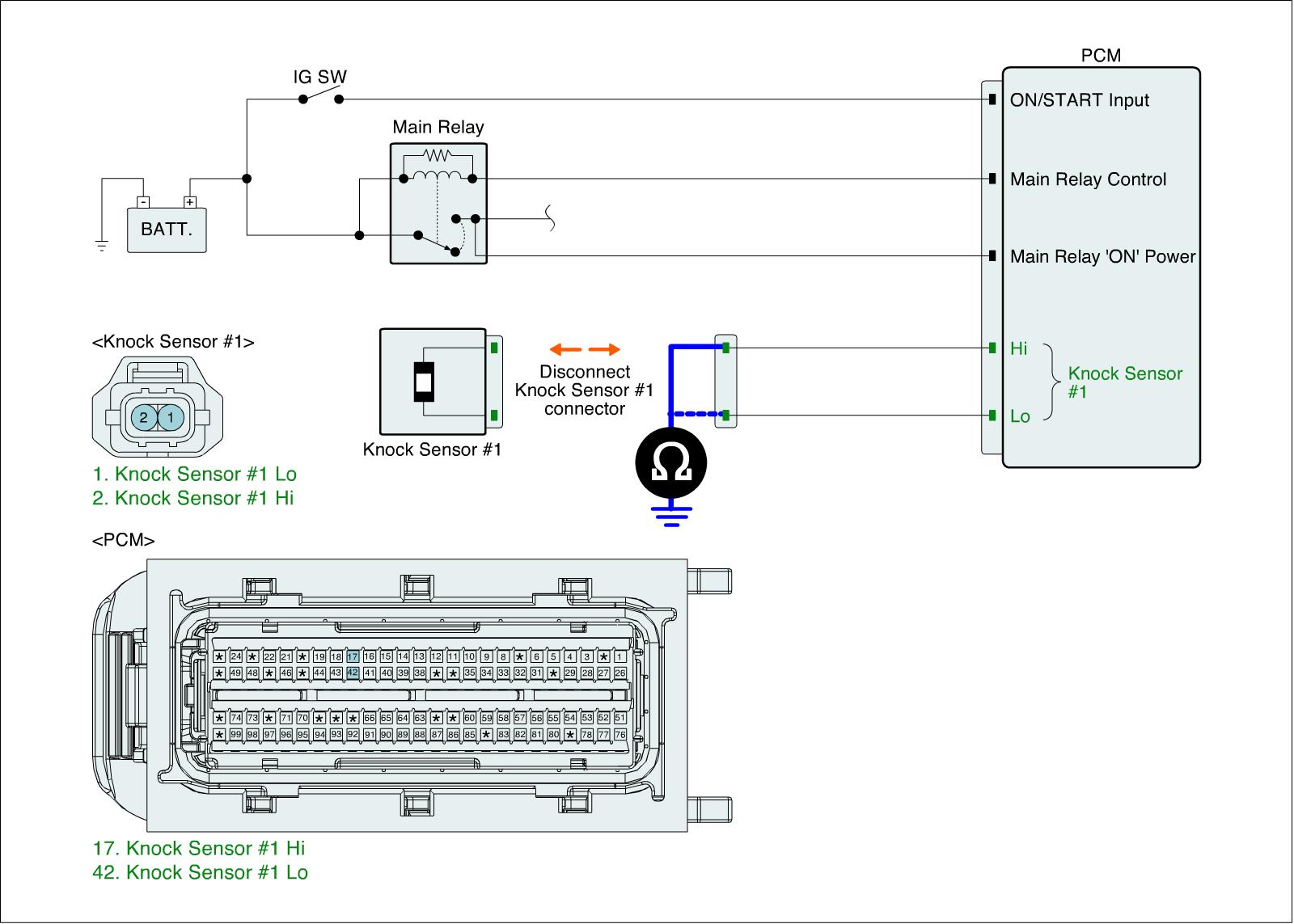 1. IG "OFF" and disconnect knock sensor connector and PCM connector.