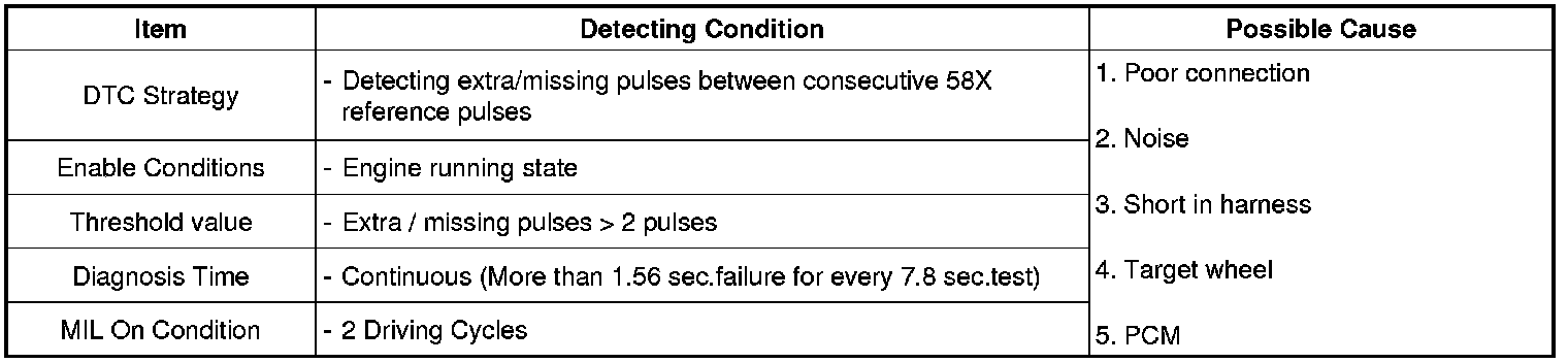 Checking output signals from CKPS every 7.8 sec. under detecting condition, if an output signal is missing or redundant for more than 1.56 sec., PCM sets P0336.