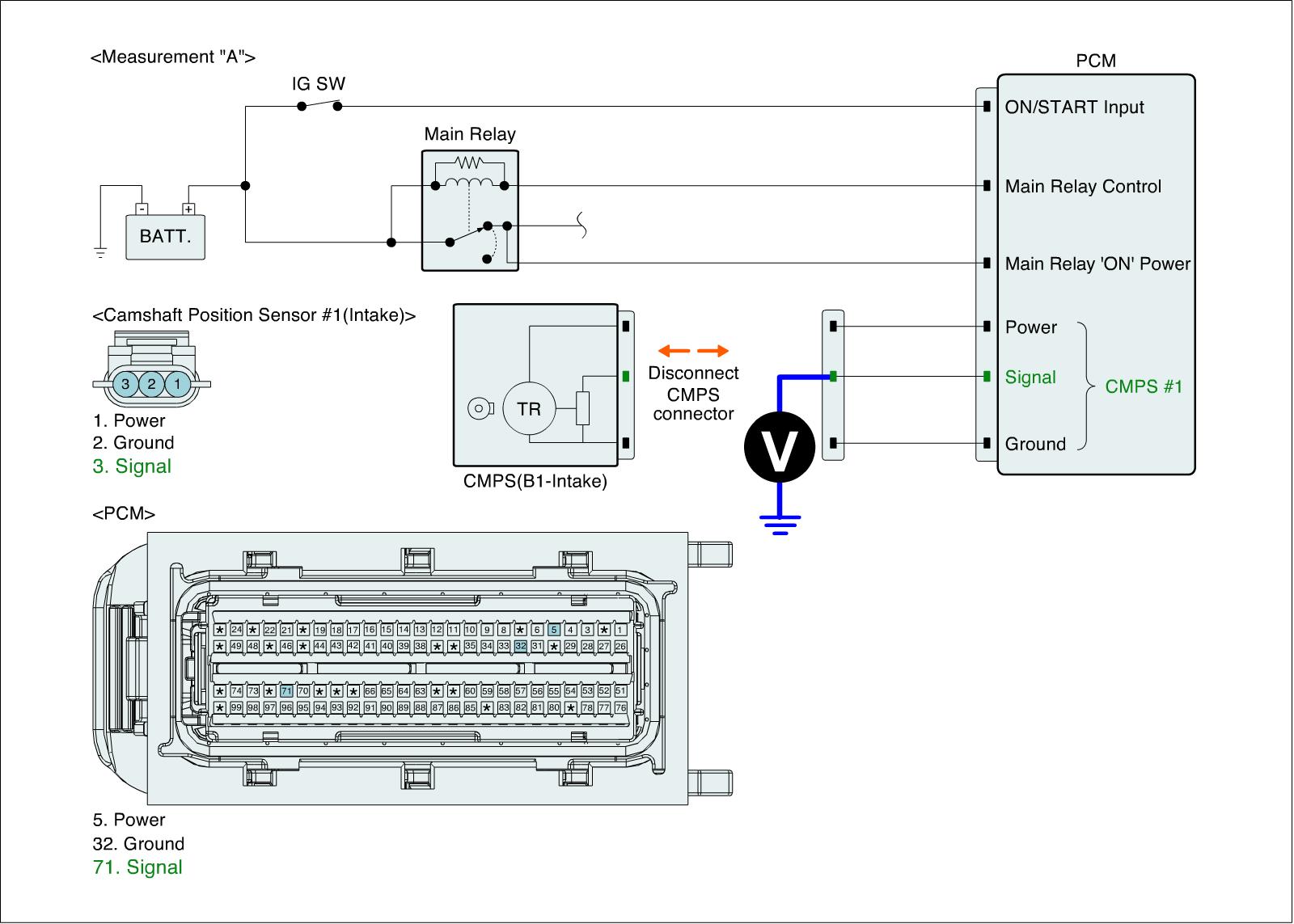 2. Measure voltage between signal terminal of CMPS (B1-Intake) harness connector and chassis ground. (Measurement "A")