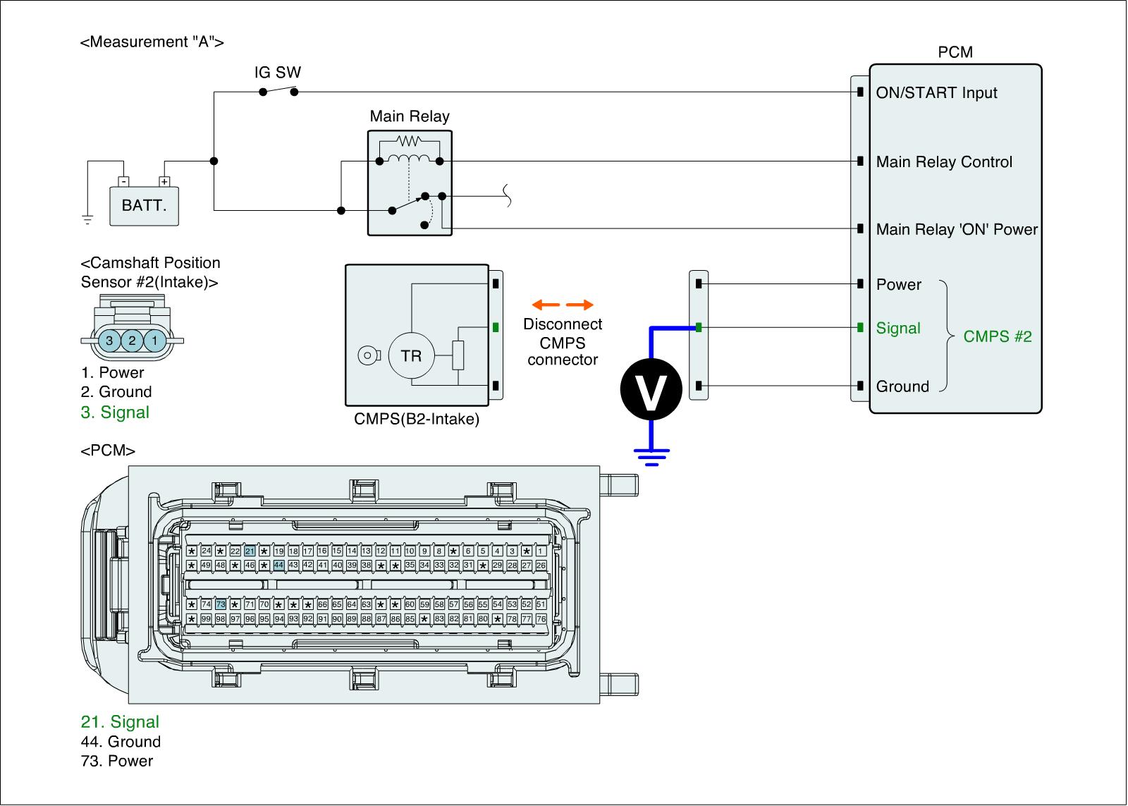 2. Measure voltage between signal terminal of CMPS (B2-Intake) harness connector and chassis ground. (Measurement "A")