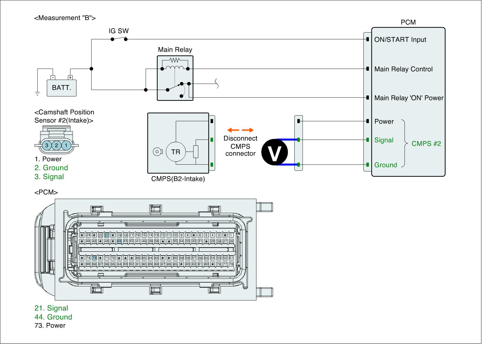 3. Measure voltage between signal and ground terminals of CMPS (B2-Intake) harness connector. (Measurement "B")