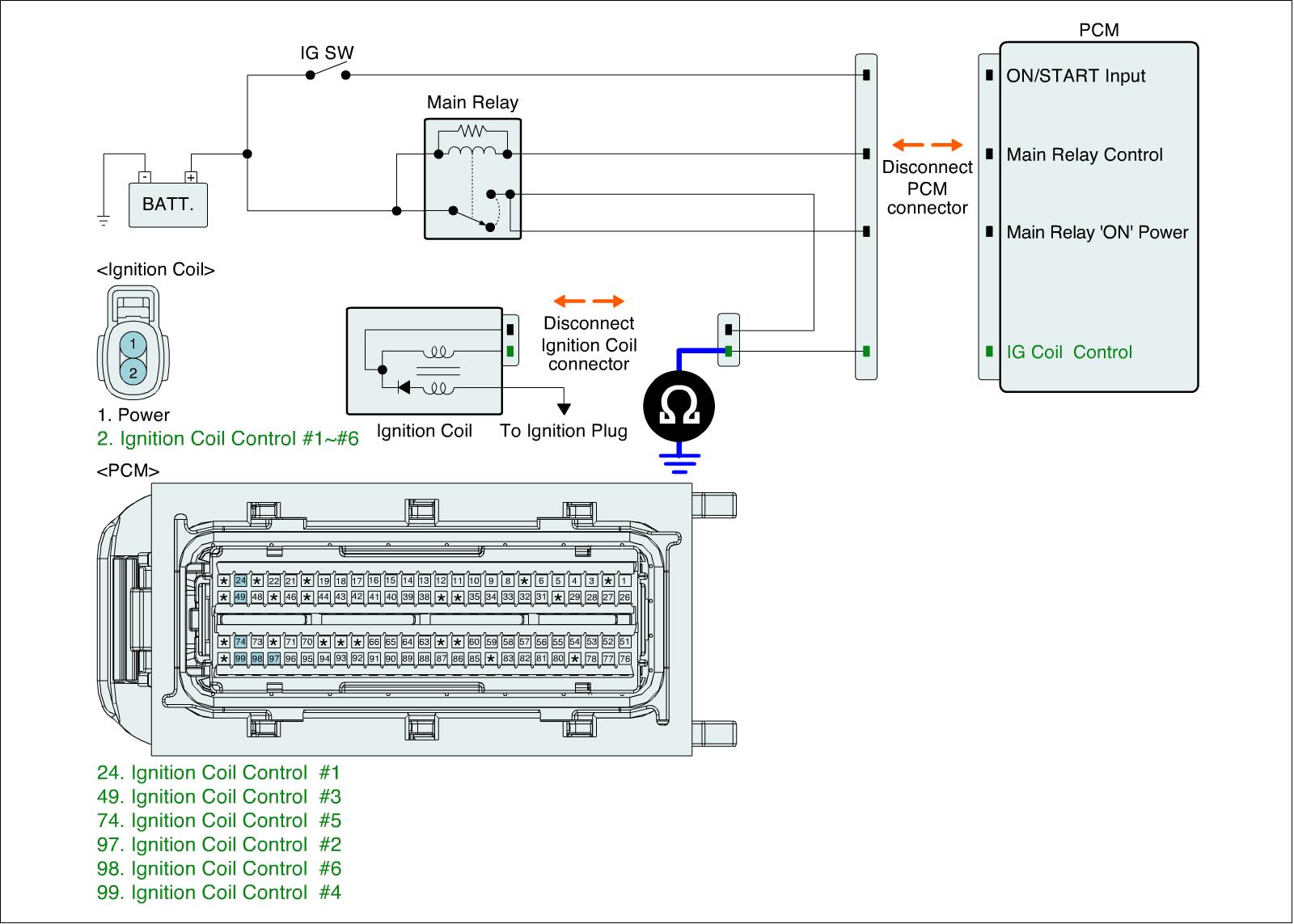 1. IG "OFF" and disconnect Ignition Coil connector and PCM connector.