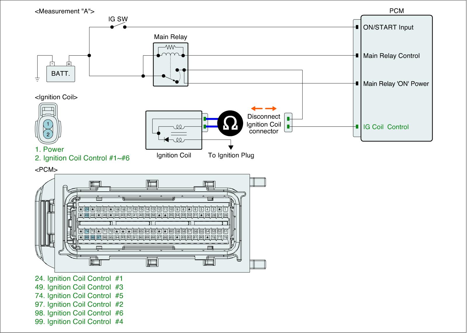 2. Measure resistance between power and signal terminals of ignition coil connector. (Measurement "A")