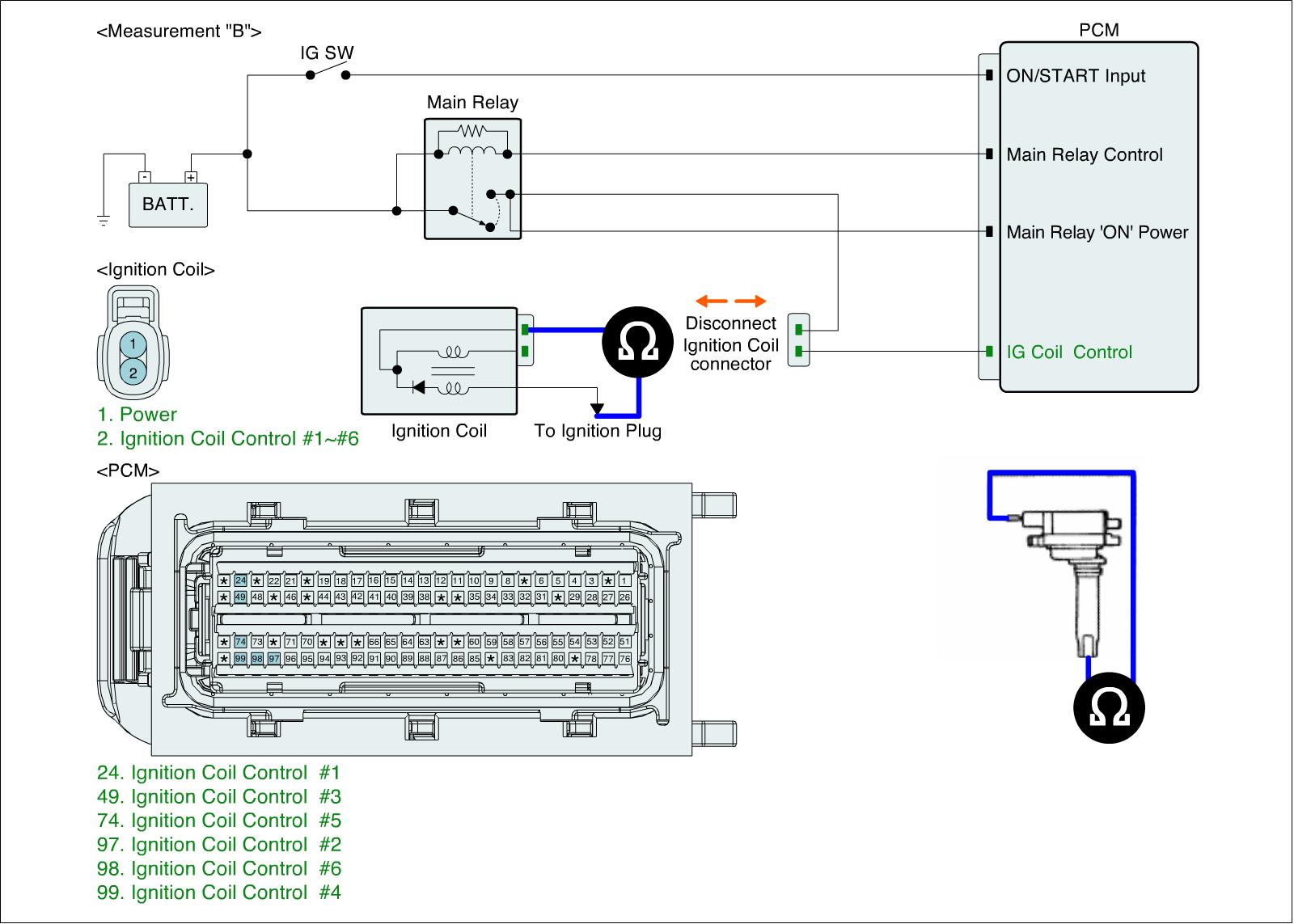 3. Measure resistance between power terminal of ignition coil connector and out terminal of secondary ignition coil. (Measurement "B")