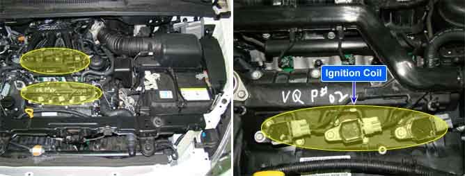 With the ignition switch in the ON or START position, voltage is applied to the ignition coil. Each ignition coil consists of two coils. High tension leads go to each cylinder from the ignition coils. The ignition coils fire two spark plugs on every power stroke (the cylinder under compression and the cylinder on the exhaust stroke). The Engine Control Module (PCM) provides a switching circuit to ground for energizing the primary ignition coils. The PCM uses the crankshaft position sensor and camshaft position sensor signal to time the energizing of the coil. When a primary ignition coil is energized and de-energized, the secondary coil produces a high voltage spike to the attached spark plugs.