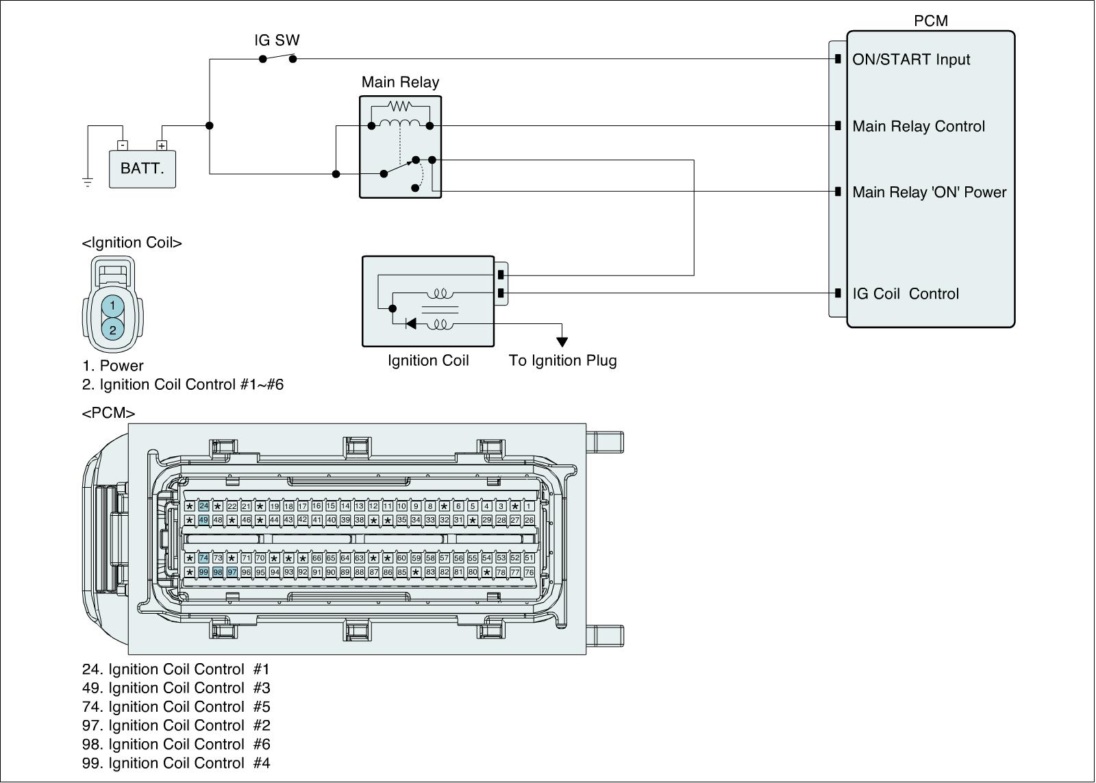 Checking output signals from ignition coils every 10 sec. under detecting condition, if the signals indicating open or short in the circuit are detected for more than 5 sec., PCM sets this DTC.