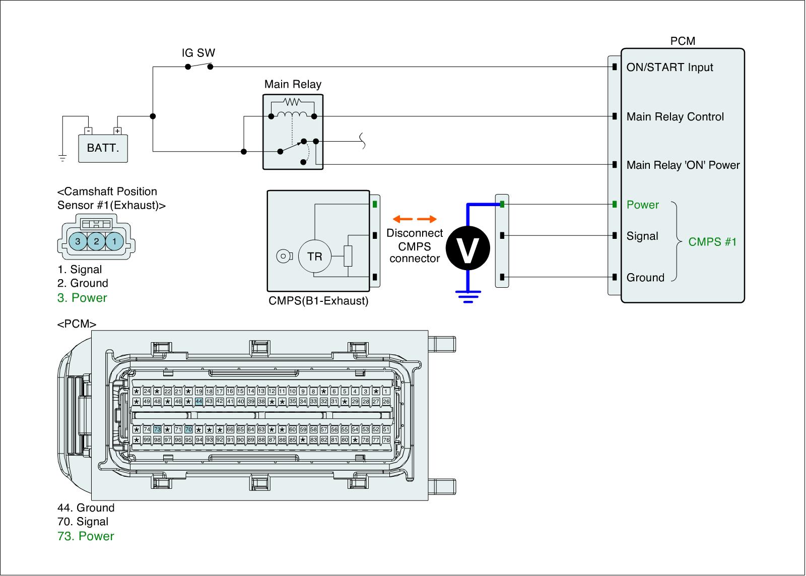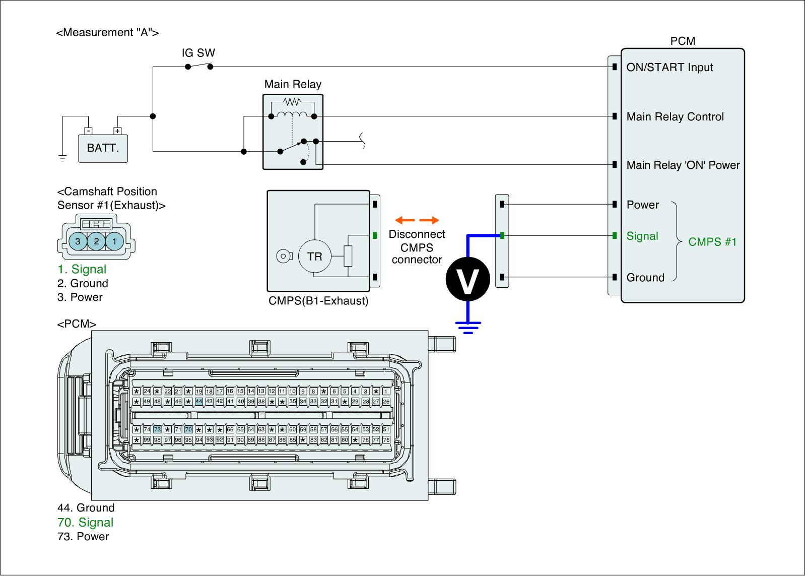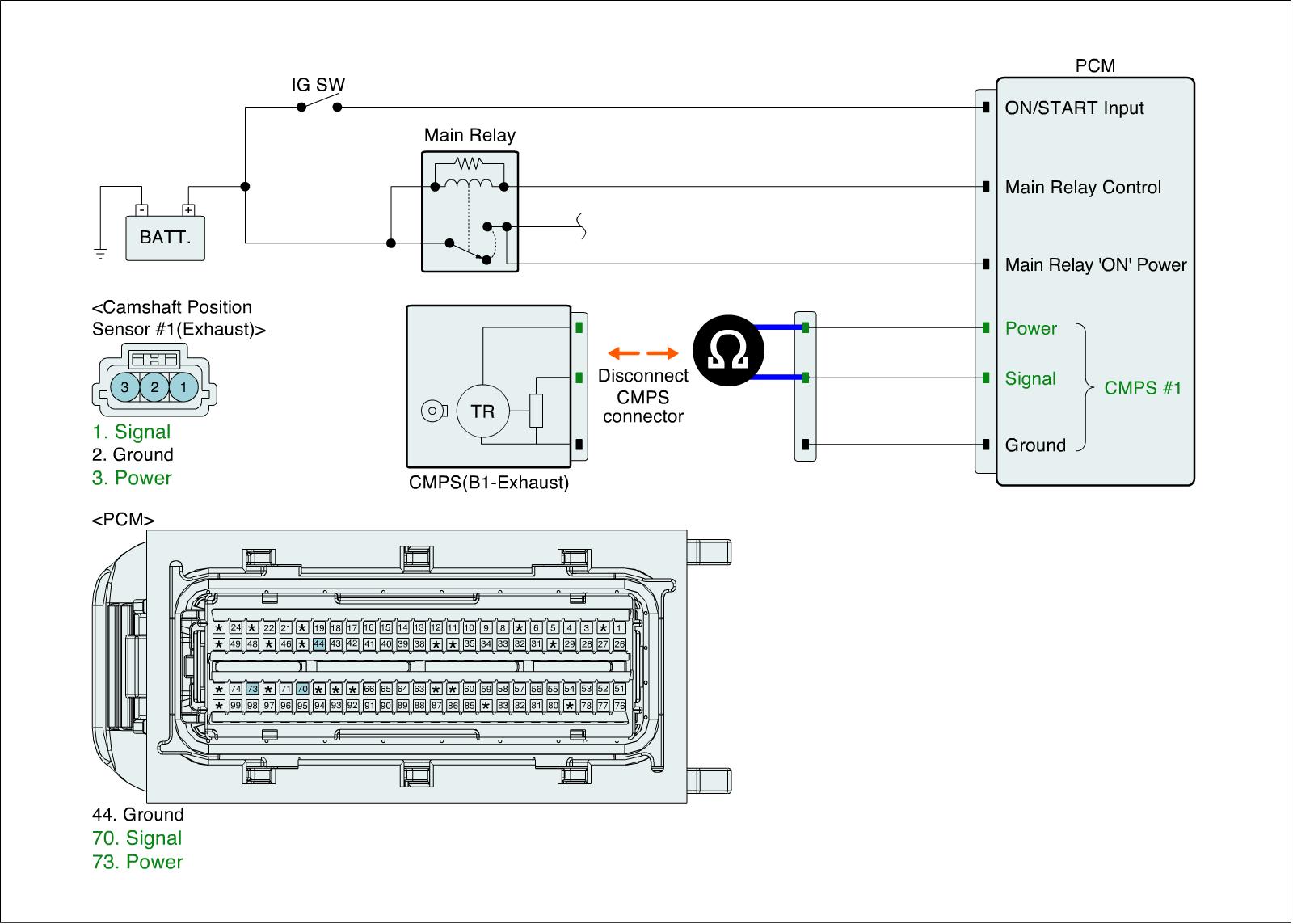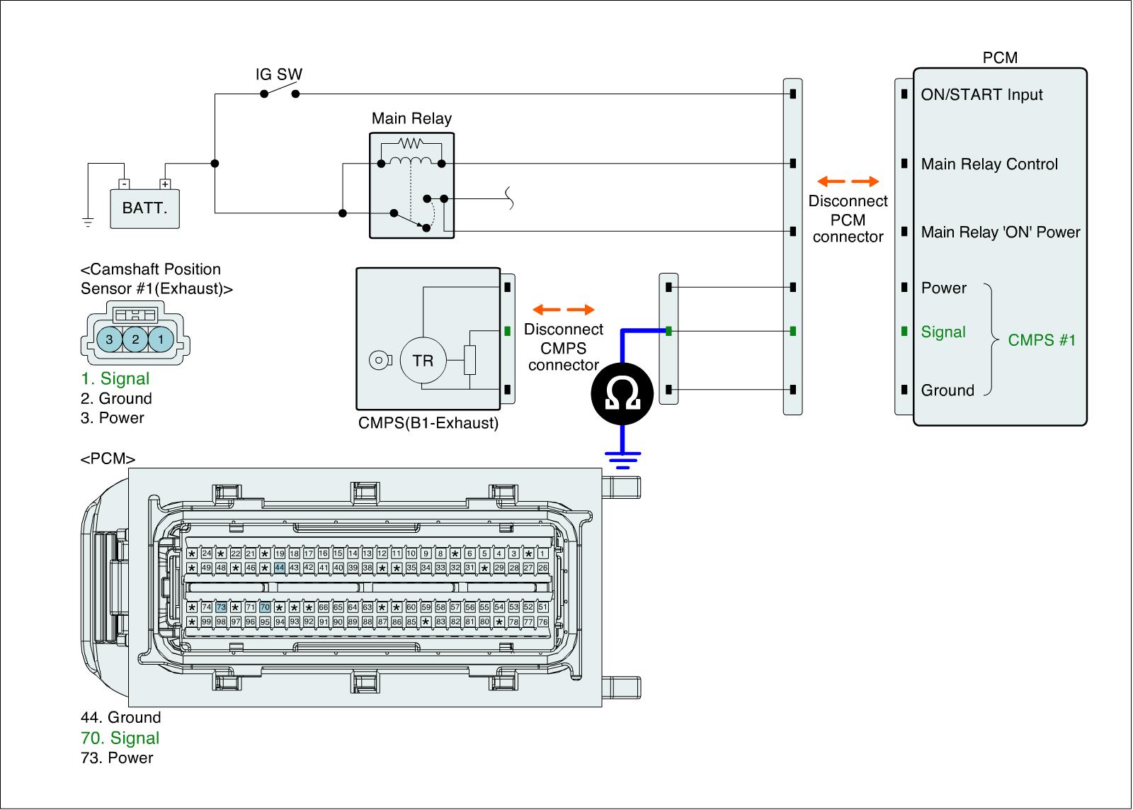 1. IG "OFF" and disconnect CMPS (B1-Exhaust) connector and PCM connector.