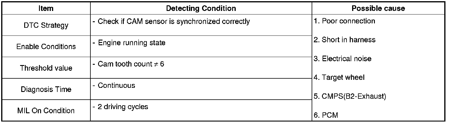 Checking output signals from CMP during engine running, if the expected number of cam tooth count is not observed, PCM sets P0391.