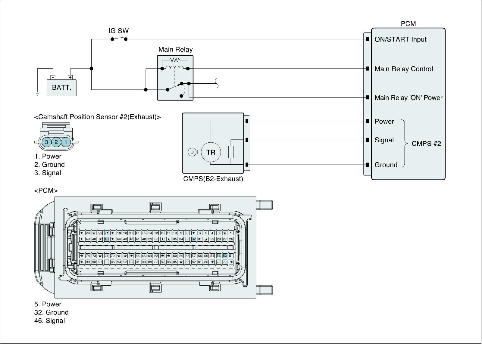 The Camshaft Position Sensor (CMPS) is a sensor that detects the compression TDC of the NO. 1 cylinder. The CMPS consists of a hall type sensor and a target on the end of the intake camshaft. When the target triggers the sensor, the sensor voltage is 5 V. If not, the sensor voltage is 0 V. These CMPS signal is sent to the PCM and the PCM uses the CMPS signal for synchronizing the firing of sequential fuel injectors.