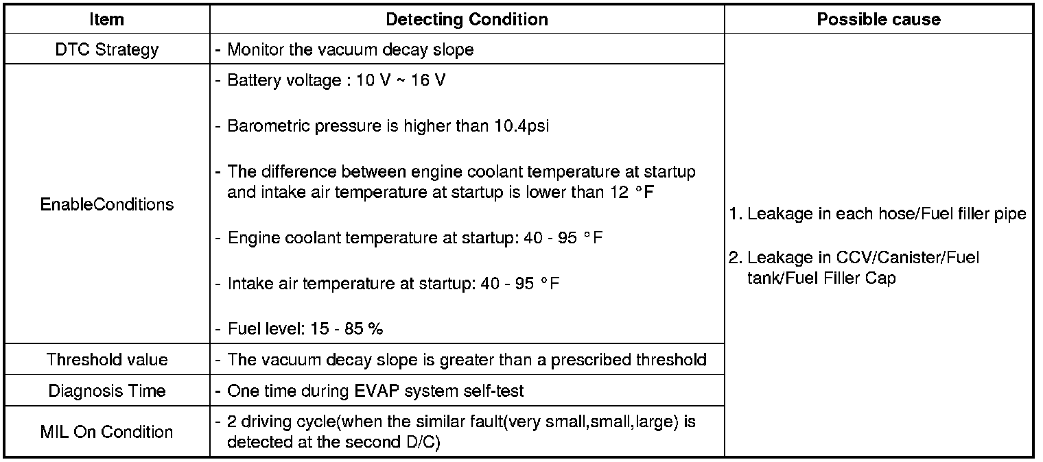 The Powertrain Control Module (PCM) monitors the output signal from the Fuel Tank Pressure Sensor (FTPS) during the Evaporative Emission Control System (EVAP) vacuum self-test. With vacuum present and both the Purge Control Solenoid Valve (PCSV) and Canister Close Valve (CCV) closed. The PCM monitors the fuel tank's vacuum decay slope. If it decays (leaks) higher (faster) than the prescribed threshold, the PCM sets P0442 and turns on the Malfunction Indication Lamp (MIL).